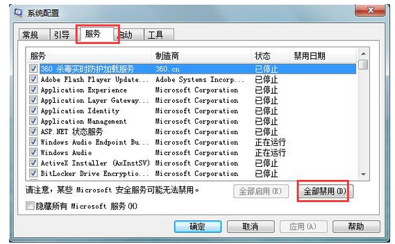 2、在系統配置窗口中,點擊服務選項,將不必要的服務全部打勾,點擊全部禁用,如圖所示: