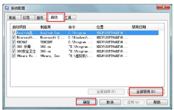 3、在切換啟動選項,將不必要的選項勾選,在點擊全部禁用,然后點擊確定即可,如圖所示: