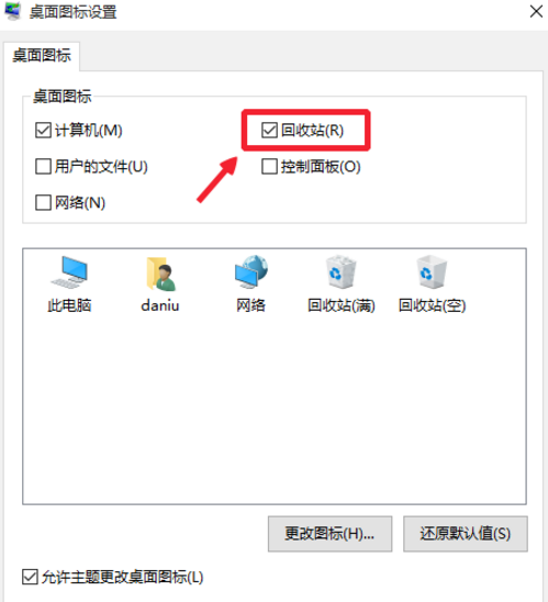 3、在桌面圖標設置頁面,在回收站圖標前面選擇對勾選擇,然后確定即可。
