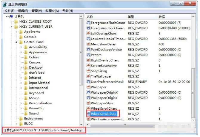 2、展開至HKEY_CURRENT_USER/Control Panel/Dosktop,在右側(cè)找到并雙擊打開“WheelScrollLines”,將數(shù)據(jù)數(shù)值修改為“3”,點擊確定保存;