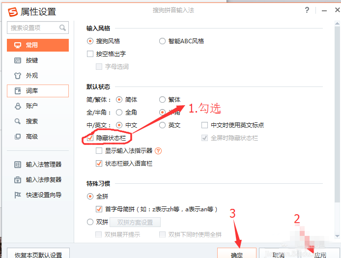 3、搜狗輸入法選項(xiàng)-常用-默認(rèn)狀態(tài)-隱藏狀態(tài)欄-應(yīng)用-確定,
