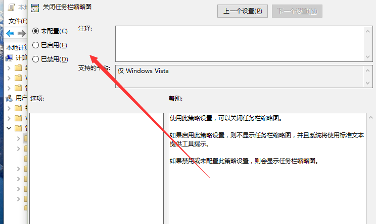 5、在“關閉任務欄縮略圖”對話框中,將其設置更改為“未配置”選項,然后在點擊“應用-->確定”按鈕退出即可。如圖所示;