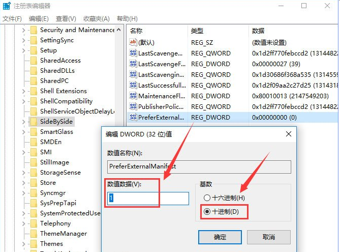 3、雙擊打開“PreferExternalManifest”,將數(shù)值數(shù)據(jù)修改為“1”,然后修改為“十進制”點擊確定;