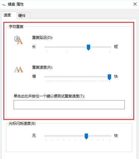 3、打開的鍵盤屬性設置中,就可以看到鍵盤速度設置了,包括重復延遲、重復速度快慢等等,如果您打字速度足夠快,可以將重復延遲時間設置的更短一些,這樣有利于提升打字速率,隨后點擊確定即可。