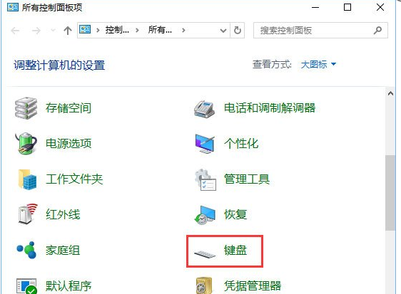 2、打開控制面板后,先將查看方式的類別選擇為“大圖標”,找到“鍵盤”并點擊打開;