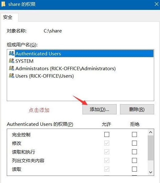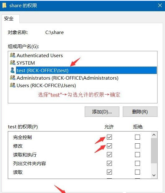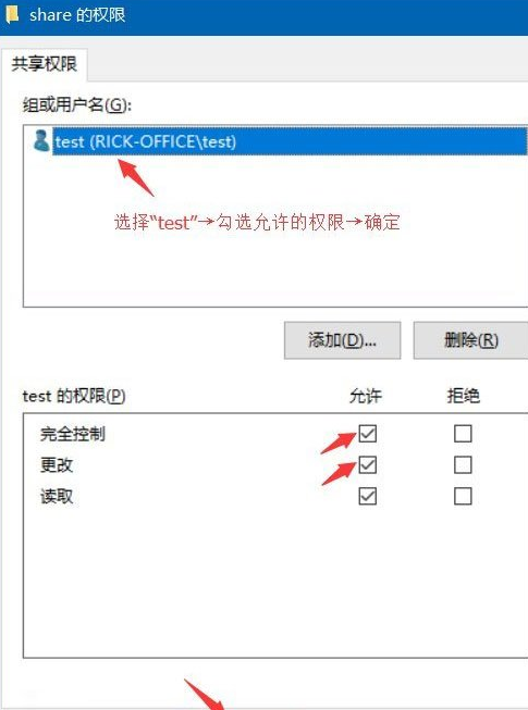 11、選擇“test”→勾選允許的權(quán)限→確定;