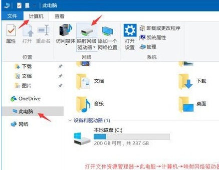 13、打開文件資源管理器→此電腦→計算機→映射網(wǎng)絡(luò)驅(qū)動器;