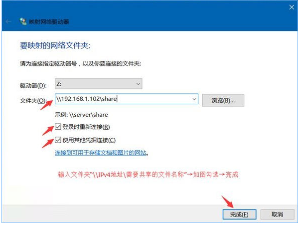 14、輸入文件夾//IPv4地址/需要共享的文件夾名稱→如圖勾選→完成;