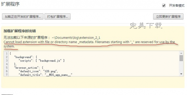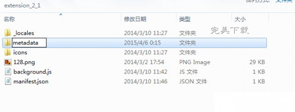 7、出現這種情況Chrome瀏覽器會提示無法加載以下來源的擴展程序: xxx路徑(Chrome插件文件的解壓位置)Cannot load extension with file or directory name _metadata. Filenames starting with "_" are reserved for use by the system.出現這種情況,是因為這款Chrome插件與新版的Chrome瀏覽器有些不兼容,這時候,用戶可以打開剛剛解壓的Chrome插件文件夾,并把其中_metadata文件夾的名字修改為metadata(把前面的下劃線去掉),如圖所示: