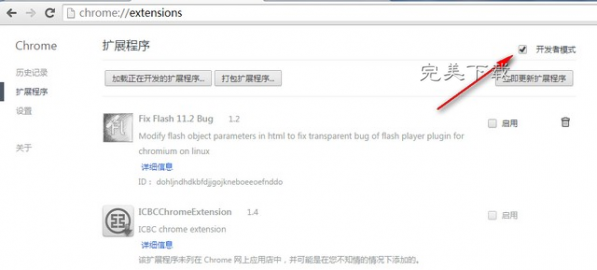 4、在Chrome的地址欄中輸入:chrome://extensions/ 打開Chrome瀏覽器的擴展程序管理界面,并在該界面的右上方的開發者模式按鈕上打勾,如圖所示: