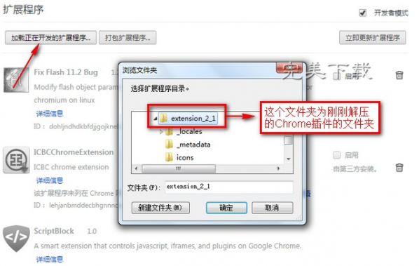 5、在勾選開發者模式選項以后,在該頁面就會出現加載正在開發的擴展程序等按鈕,點擊“加載正在開發的擴展程序”按鈕,并選擇剛剛解壓的Chrome插件文件夾的位置,如圖所示: