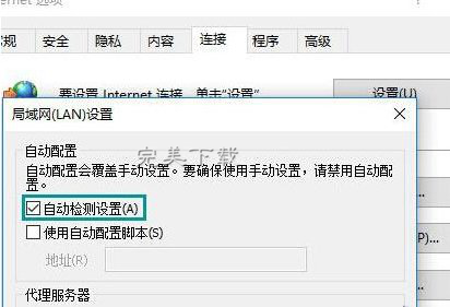 4、接著點擊連接選項卡下面的“局域網設置”,勾選“自動檢測設置”,點擊確定