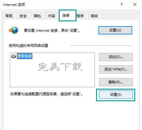 2、在Internet選項頁面中,切換至“連接”項,點擊最下面的“設置”按鈕;