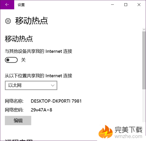 3、先點擊“編輯”修改熱點的網(wǎng)絡(luò)名稱和網(wǎng)絡(luò)密碼,修改完畢保存后,回到這個界面,點擊“與其他設(shè)備共享我的Internet連接”下的滑動開關(guān)至“開”。