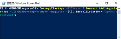 Get-AppXPackage -AllUsers | Foreach {Add-AppxPackage -DisableDevelopmentMode -Register “$($_.InstallLocation)/AppXManifest.xml”}
