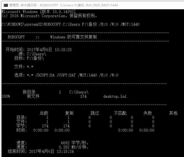 ROBOCOPY C:/Users F:/備份 /R:0 /W:0 /MOT:1440