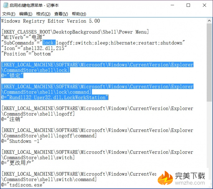 在打開的文檔里,標藍部分是菜單上電源按鈕的其中一個設(shè)置(作為范例),這里要修改第一部分“[HKEY_CLASSES_ROOT/DesktopBackground/Shell/Power Menu]”中“SubCommands”的內(nèi)容,不需要的刪除掉。