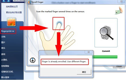 然后我們先注銷,登錄另一個帳號 [ fingerprint-re ] ,同樣的,再用同一個人的右手食指去登記,系統會提示 [ 該手指已經登記過了。使用不同的手指。