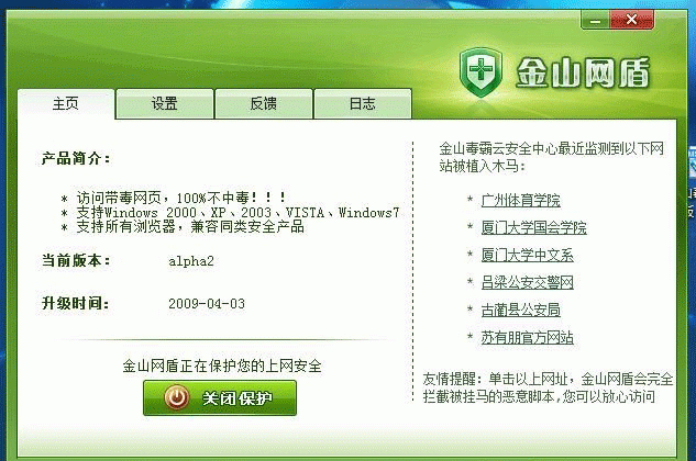 金山網(wǎng)盾是一款互聯(lián)網(wǎng)瀏覽網(wǎng)頁安全防互軟件,能全方位解決上網(wǎng)中的安全隱患,產(chǎn)品大小不到800k,安裝后占用內(nèi)存不到1M,可在不影響你正常瀏覽的前提下,防范掛馬網(wǎng)站、帶毒網(wǎng)站、釣魚欺詐等惡意網(wǎng)站,全方位解決上網(wǎng)中的安全隱患,產(chǎn)品支持所有瀏覽器,不卡瀏覽器,使瀏覽更順暢,完全免費(fèi),無任何插件,是上網(wǎng)必備軟件。