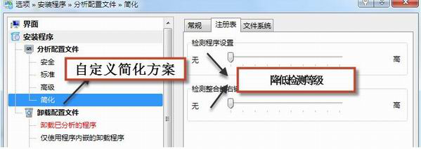 自定義配置是一種參數模板,可以額外創建用戶的配置。比如默認的配置都需要嚴格檢測安裝文件位置,拖慢分析速度。如圖所示,可以創建額外的“簡化”配置,降低文件檢測等級。不重要的軟件卸載時,可以利用“簡化”配置,用精確換速度,提升分析效率。