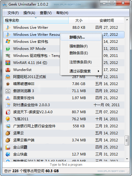 GeekUninstaller 支持 Windows7/XP/Vista/2003/2008,最新的 Windows8 也沒問題。它的界面非常簡單,就一個已安裝軟件的列表,右鍵點擊軟件,即可進行相應的操作,如卸載、強制卸載、刪除條目、注冊條目、安裝文件夾、程序網站和通過谷歌搜索軟件相關信息,基本上也不需要我過多的描述了。