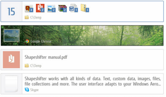 在安裝好 Shapeshifter 之后,它會提供3種不同的工作模式讓你選擇,一種是集成模式:長按 CTRL+V 呼出剪貼板列表。只要用鼠標點擊其中一個就實現了對它的粘貼。Shapeshifter 還有擴展模式,它會在任務欄上顯示一個 Shapeshifter 的任務,鼠標指住它時將會以小窗口預覽的形式列出你最近復制過的項目,鼠標點擊其中任意的項目之后,按 CTRL+V 粘貼即可。這相當于有了一個可視化的剪貼板歷史列表了。