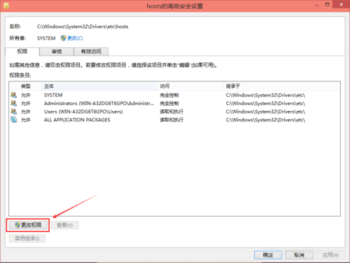 在hosts的高級安全設置界面點擊更改權限,如下圖所示。