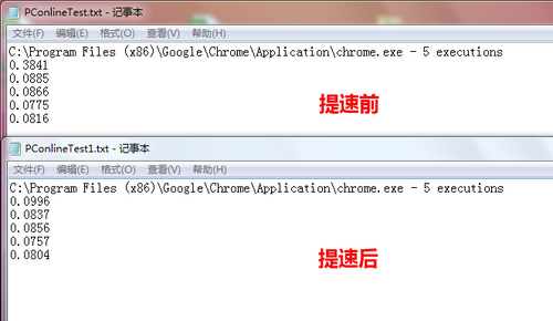 從上面圖片可以看到,啟動Chrome瀏覽器5次所花的時間比提速前的時間要少,最為明顯的第一次啟動時間上的差別。雖然啟動軟件后,瀏覽器速度不會提高幾倍,但還是有一定的效果。如果遇到同樣問題的用戶,可以下載本軟件試試
