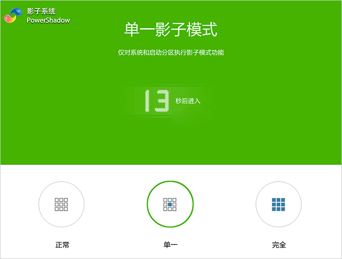 PowerShadow 支持單一影子模式以及完全影子模式,從真實系統進入單一或完全影子模式可以很快完成,而從影子模式恢復到普通模式則需要重啟電腦。單一影子模式的意思是影子模式只對系統盤(一般是 C 盤)生效,也就是說,進入單一影子模式后,你對 C 盤的更改會在下次重啟被撤銷,而對 D 盤、E 盤等其他盤符的更改則會保留。而完全影子模式則是包含整個硬盤所有盤符。