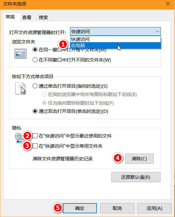 2、按照下圖,依次選擇“打開文件資源管理器時打開”此電腦,去除在“快速訪問”中顯示最近使用的文件與在“快速訪問”中顯示常用文件夾前面的對勾,并點擊清除當前記錄。最后點擊確認或應用即可。