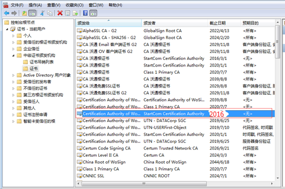 第二步:找到“中級證書頒發機構”找到如下圖的證書(注意截至日期是2016年3月1日頒發給是“Certificatetion Authority of WoSign”頒發者是“StartCom Certification Authority” )