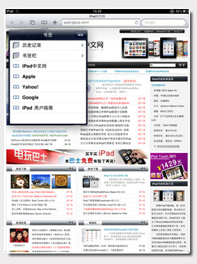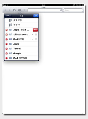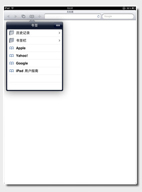 點擊屏幕上方書簽工具欄即可看到保存的相關網址以及歷史記錄和書簽欄。點擊相應書簽即進入該網站。這和我們電腦當中的收藏是一個道理。