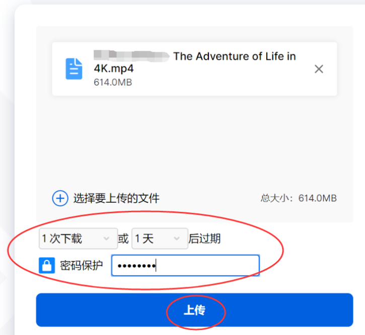 2、在跳轉的頁面中,設置好文件可下載的次數和有效期,也可以設置密碼保護;然后點擊【上傳】。