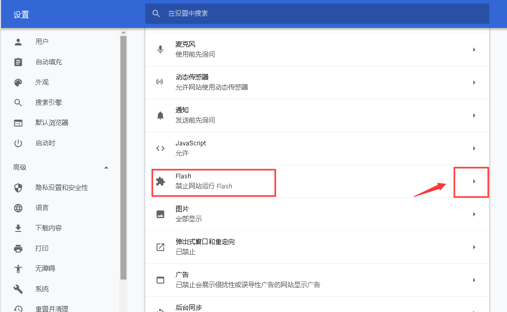或者,你可以直接在地址欄輸入chrome://settings/content,找到并點擊【Flash】選項,