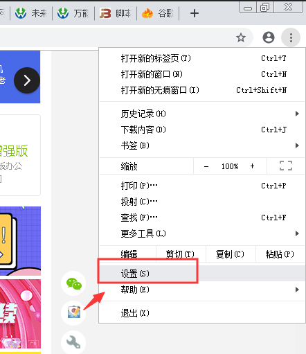 1、打開谷歌瀏覽器,點擊右上角的菜單按鈕打開菜單,選擇“設置”;