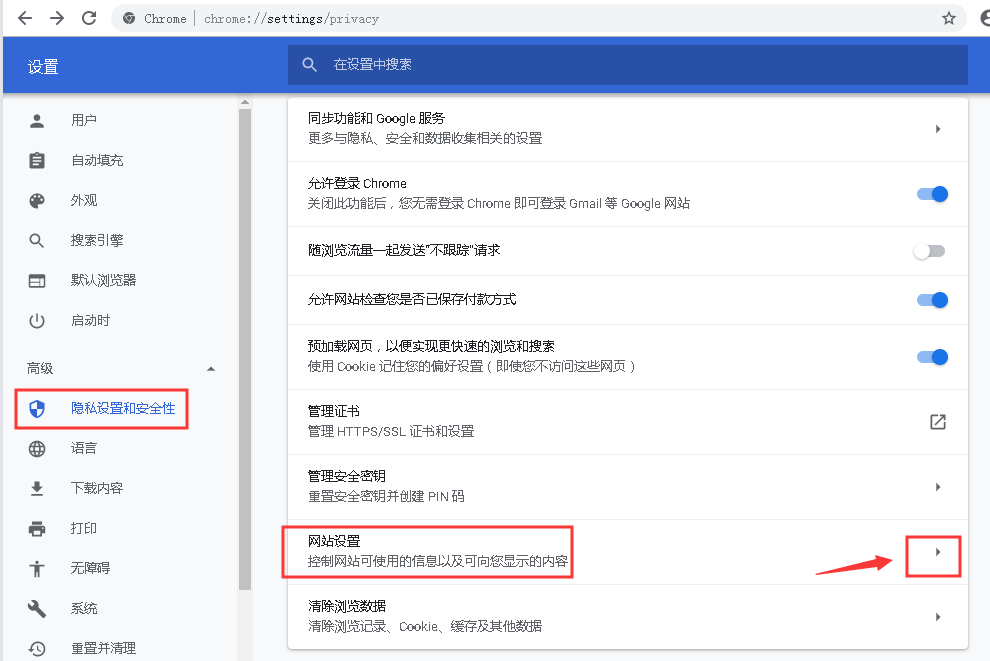 進入設置界面,在左側點擊【高級】,選擇【隱私設置和安全性】,然后找到【網站設置】功能,