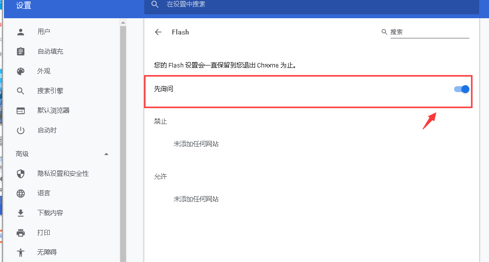 進入界面,點擊【禁止網站運行Flash】,系統默認是關閉的,將其打開,即可解決問題。