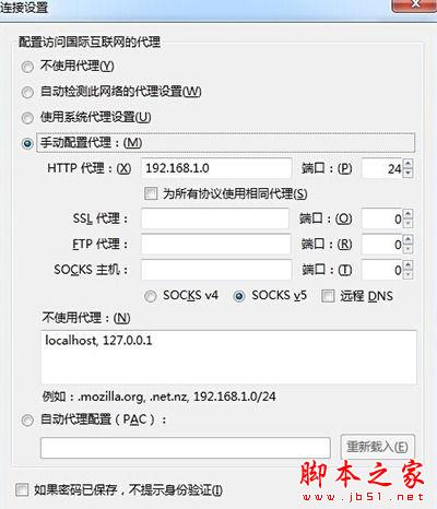 最后我們選擇手動(dòng)配置代理,輸入可用的代理IP地址和端口。比如.mozilla.org,.net.nz,192.168.1.0:24