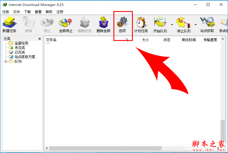 2、打開IDM下載器,進入主界面,點擊上方工具欄中的【選項】,
