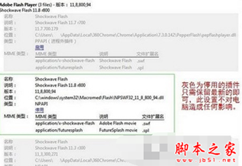 3、找到Adobe Flash Player或者Flash插件項(一般第一個就是),停用所有的Shockwave Flash,只留下剛剛安裝的版本11.8,其他所有東西都不用改動,重啟瀏覽器讓Flash插件起效即可!