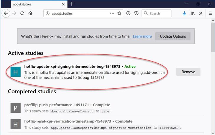 該修復程序正在逐步推出。要檢查你是否有修復,可以在位置欄中輸入“about:studies”。如果修復程序處于活動狀態,你將看到“hotfix-update-xpi-signing-intermediate-bug-1548973” 或者 “hotfix-reset-xpi-verification-timestamp-1548973”。