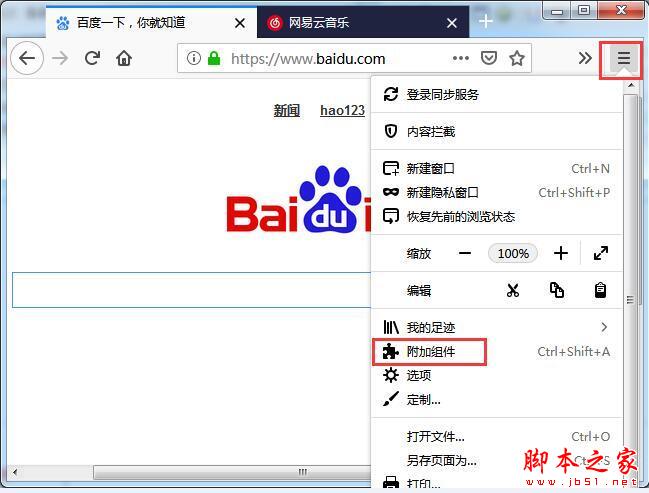 2、點擊瀏覽器右上角的菜單,然后點擊附件組件,如圖: