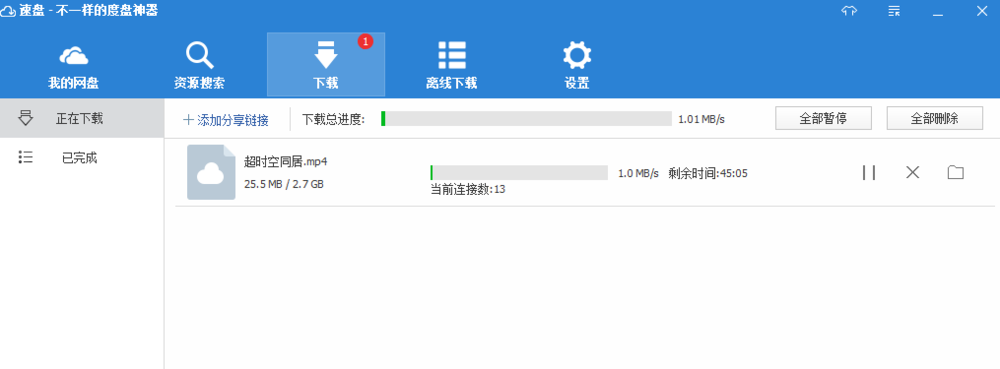 5、點(diǎn)擊工具欄第三個(gè)“下載”,資源正在以每秒1MB的速度下載中。
