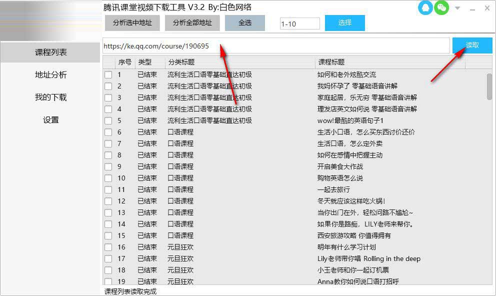 4、粘貼地址以后點(diǎn)擊讀取,下方顯示課程的全部?jī)?nèi)容