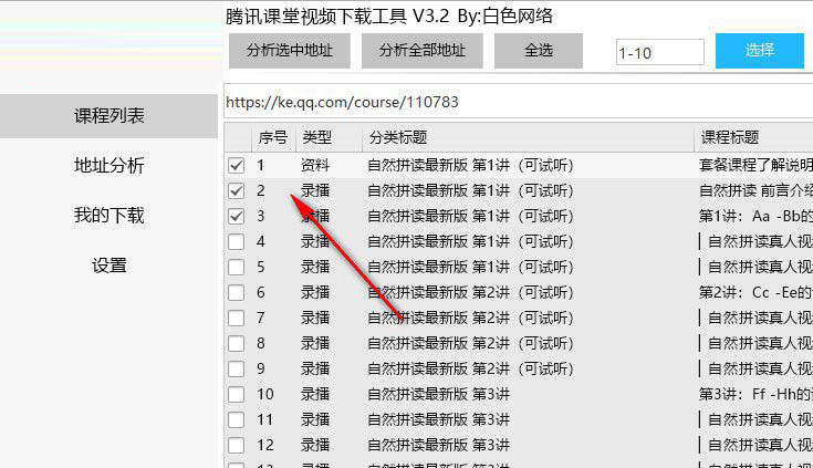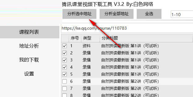 6、勾選以后點(diǎn)擊分析選擇的地址,隨后軟件自動(dòng)分析課程地址