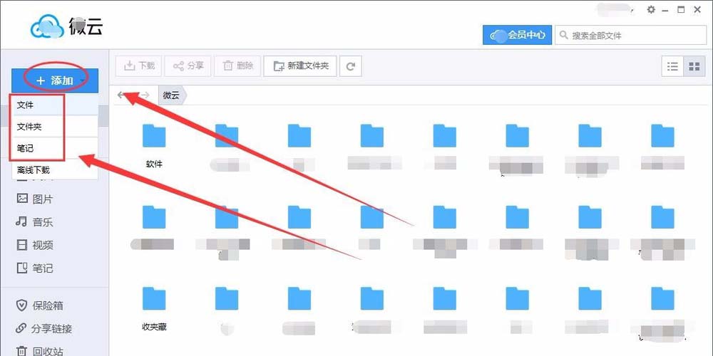 3、單擊添加按鈕,可以向微云中添加文件、文件夾和筆記。