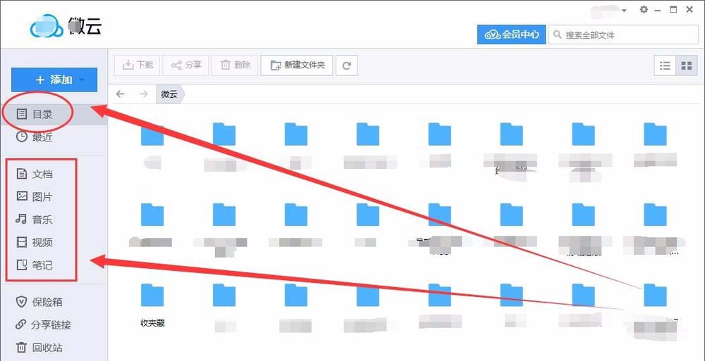 1、打開微云窗口后,單擊目錄選項,可以查看微云中的所有文件,還可以根據文檔、圖片、音樂、視頻等分類查看文件。