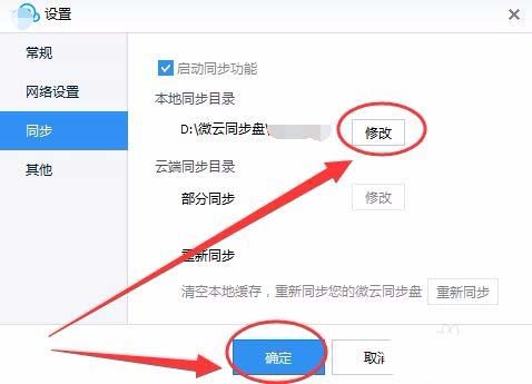 3、單擊修改按鈕,可以更改同步文件的目錄,單擊確定。