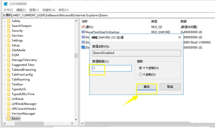 7、雙擊ZoomDisabled項次,進入設(shè)置界面,將REG_DWORD值設(shè)置為1,點擊確定按鈕即可,如下圖所示