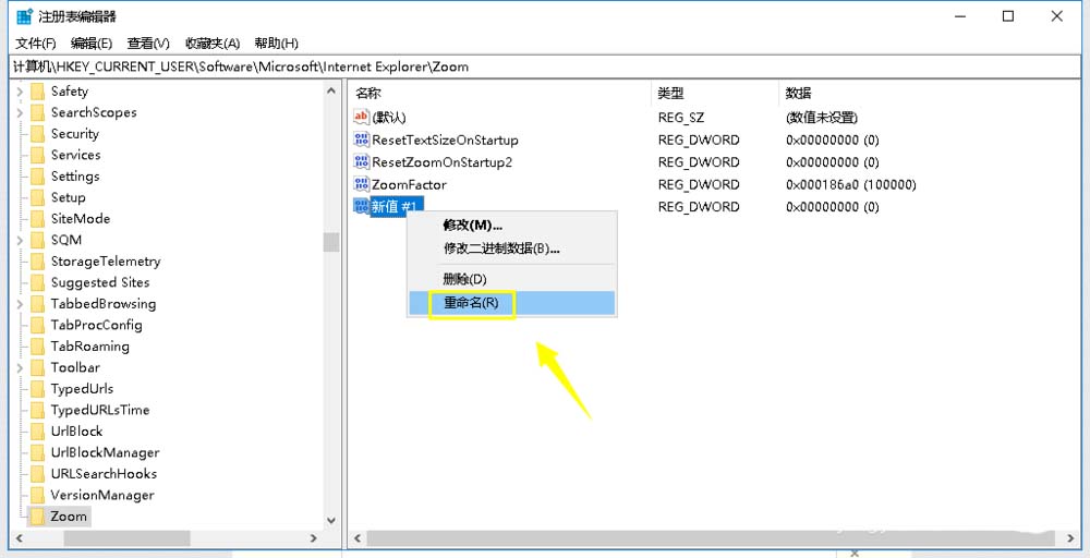 6、右鍵新建的值,選擇重命名,將這個新建的值命名為ZoomDisabled,如下圖所示